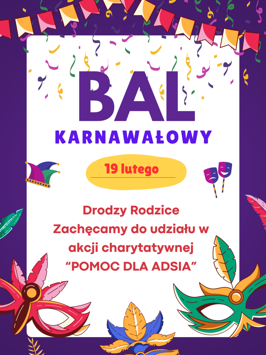 Drodzy rodzice, bal karnawałowy odbędzie się 19 lutego, jednocześnie zachęcamy do wzięcia udziału w akcji charytatywnej „Pomoc dla Adasia” https://glogow.naszemiasto.pl/8-letni-adas-z-glogowa-walczy-z-guzem-mozgu-nadzieja-dla-chlopca-jest-leczenie-w-klinice-w-usa-na-ktore-potrzebne-sa-ogromne-pieniadze/ar/c1p2-27196023