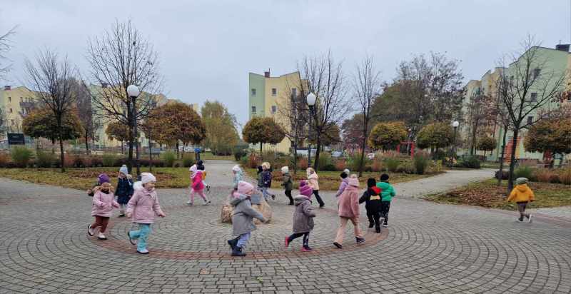 Idą dzieci przez park śmiało, liści szeleszczących niemało. Patrzą, gdzie kasztan spada, czy żołądź w trawie się układa.