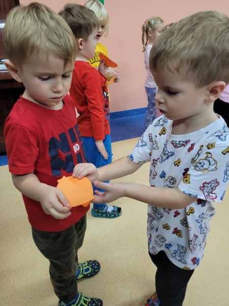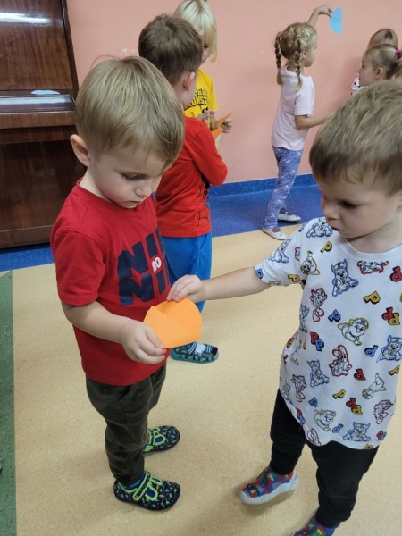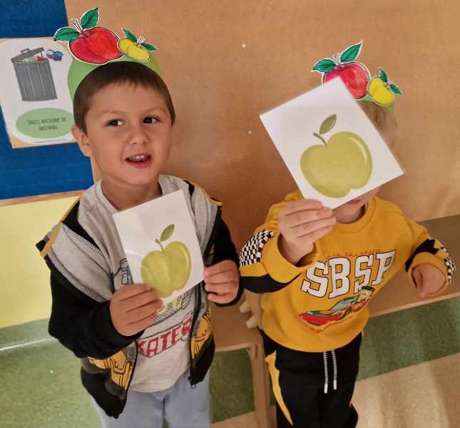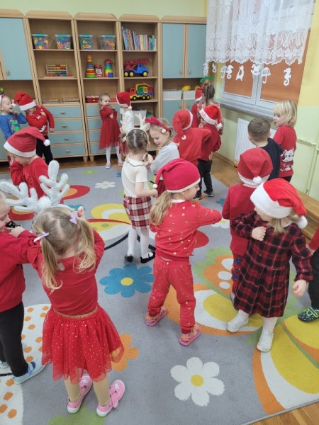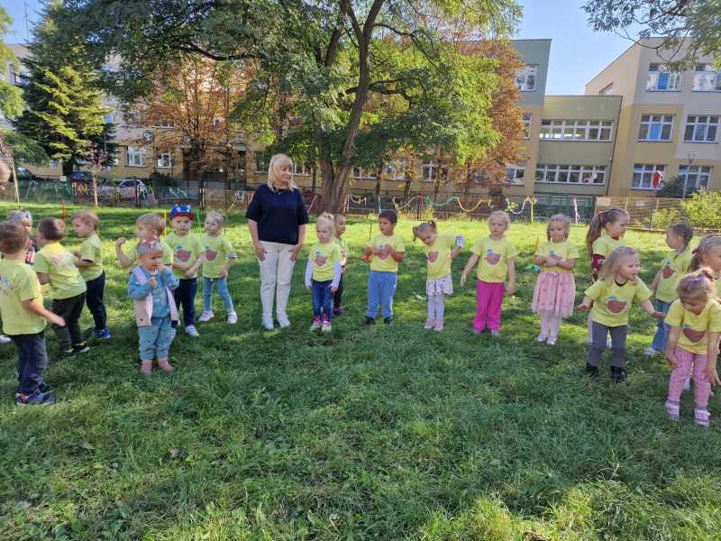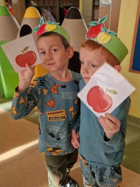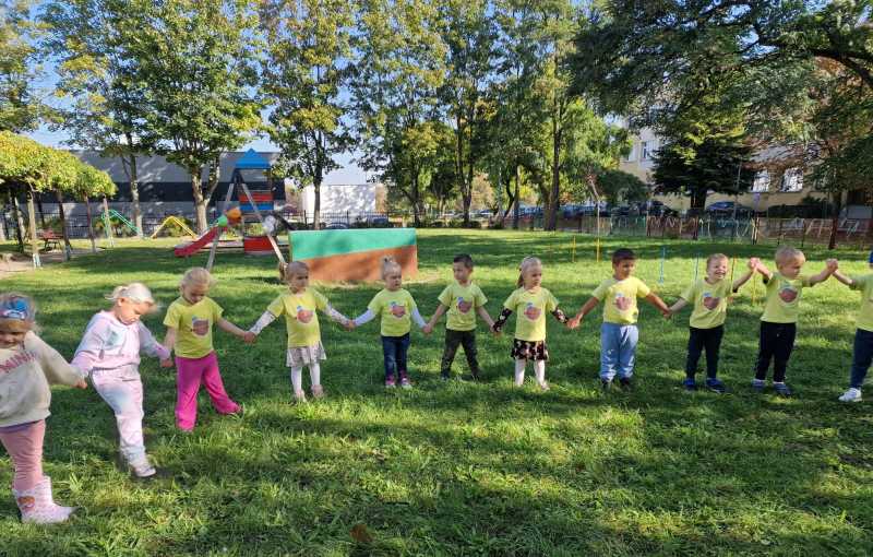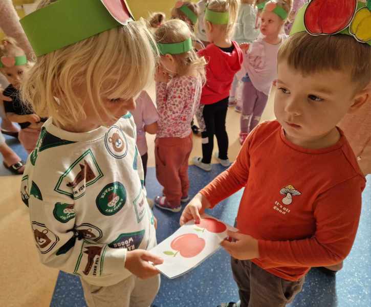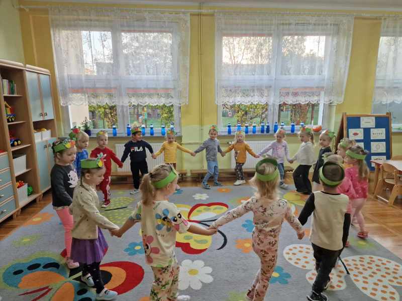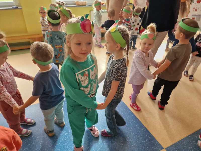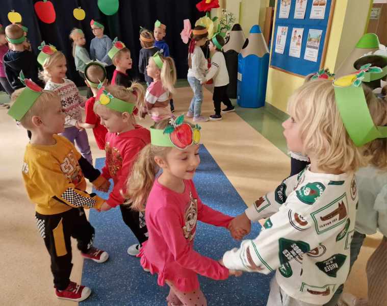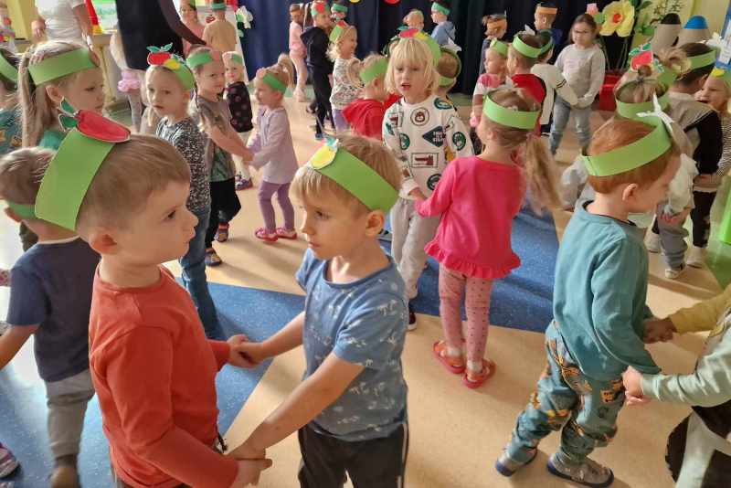 Za rączki się trzymają i w koło obracają Małe czerwone jabłuszko tańczy