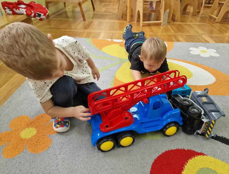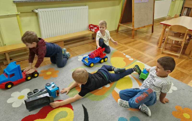 Zabawa w radiowozy, role różne w scenariuszu, dziecięca ciekawość w każdym radosnym ruchu.