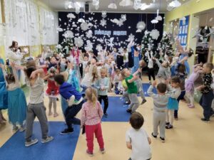 spostrzegawczych : wzroku, słuchu, węchu, dotyku, oraz wrażeń smakowych. Głównym motywem przewodnim była bajka ” Kraina Lodu”. To był wspaniały dzień 🙂
